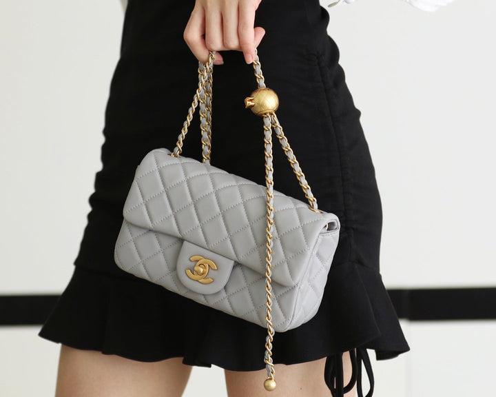 - Color: Grey leather, gold hardware