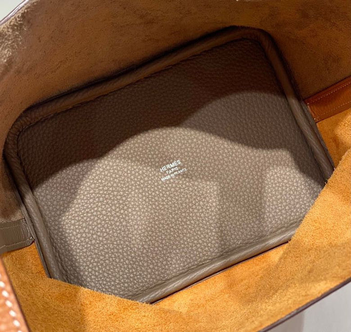 HERMES 25S PICOTIN LOCK 18 IN BROWN AND ORANGE COMBINATION CALFSKIN SILVER HARDWARE