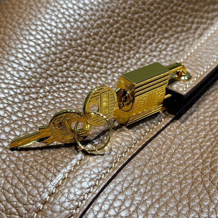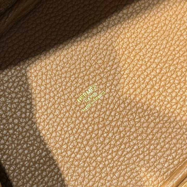 HERMES 25S PICOTIN LOCK 18 IN BURNT CARAMEL CALFSKIN GOLD HARDWARE
