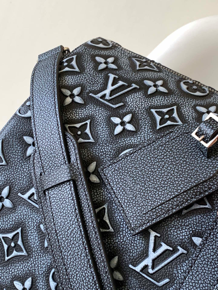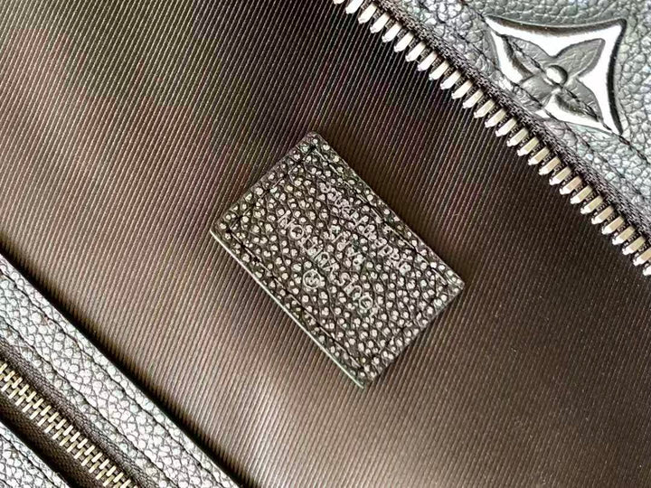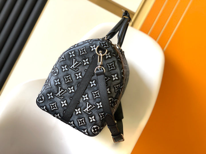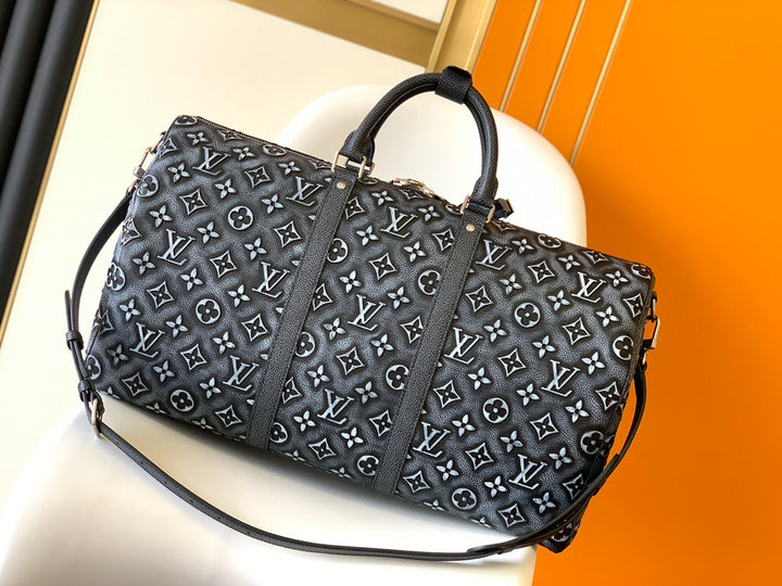 The p880 top-grain leather Keepall Bandoulière 50 travel bag, M21375 in Graphite Grey, is one of Louis Vuitton's classic holiday designs. This version uses both embossing and printing techniques to depict a faded Monogram pattern on the leather surface.