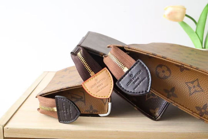 ?A collection of three different sizes of cosmetic bags, titled "Trio of Bosh Tovare." Made of Monogram Reverse canvas with a brightly colored, water-washable lining.