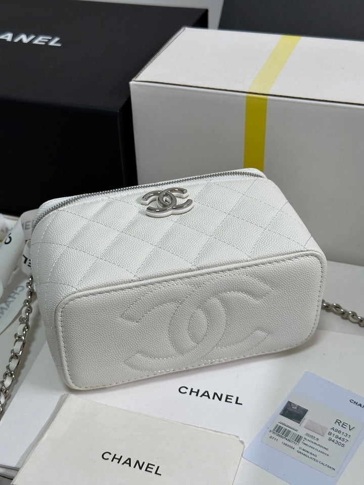 MINI VANITY TOP HANDLE CASE 17 IN WHITE CAVIAR SKIN SILVER-TONE PLATED METAL