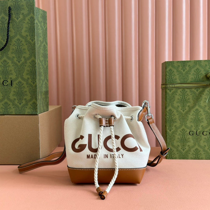 SMALL DRAWSTRING SHOULDER BAG 21 IN WHITE CANVAS BROWN CALFSKIN